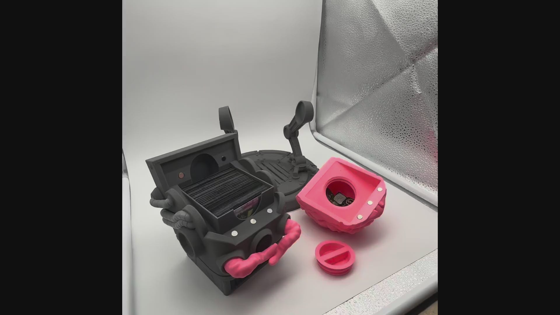Rule the table with the unmistakable presence of an alien mastermind. This sci-fi inspired commander deck box features a detailed brain-like overlord seated within a mechanical exosuit, blending bold character design with functional storage for your favorite deck. Designed to hold a full 100-card double-sleeved Commander deck, the cockpit area integrates a magnetic lid that keeps your cards secure while maintaining the striking sculpted appearance. The alien head itself also functions as the lid and includes a hidden internal compartment, perfect for storing dice, tokens, or counters so everything you need stays organized in one place. The industrial base and organic textures create a display-worthy piece that stands out on the table or shelf.